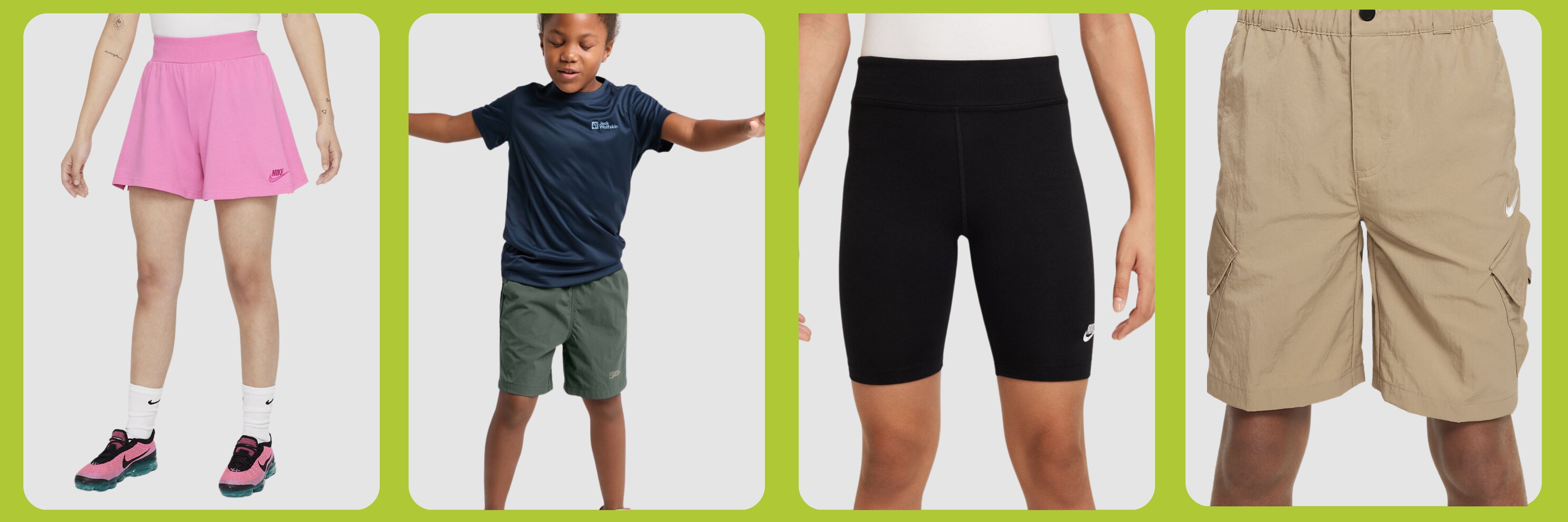 Shorts: Lightweight shorts are an essential item for outdoor activities. They don't restrict movement, allowing children to run and play freely. We have plenty of options for toddlers, active kids and modern teenagers, from classic monochrome shorts to brightly coloured shorts with floral patterns.