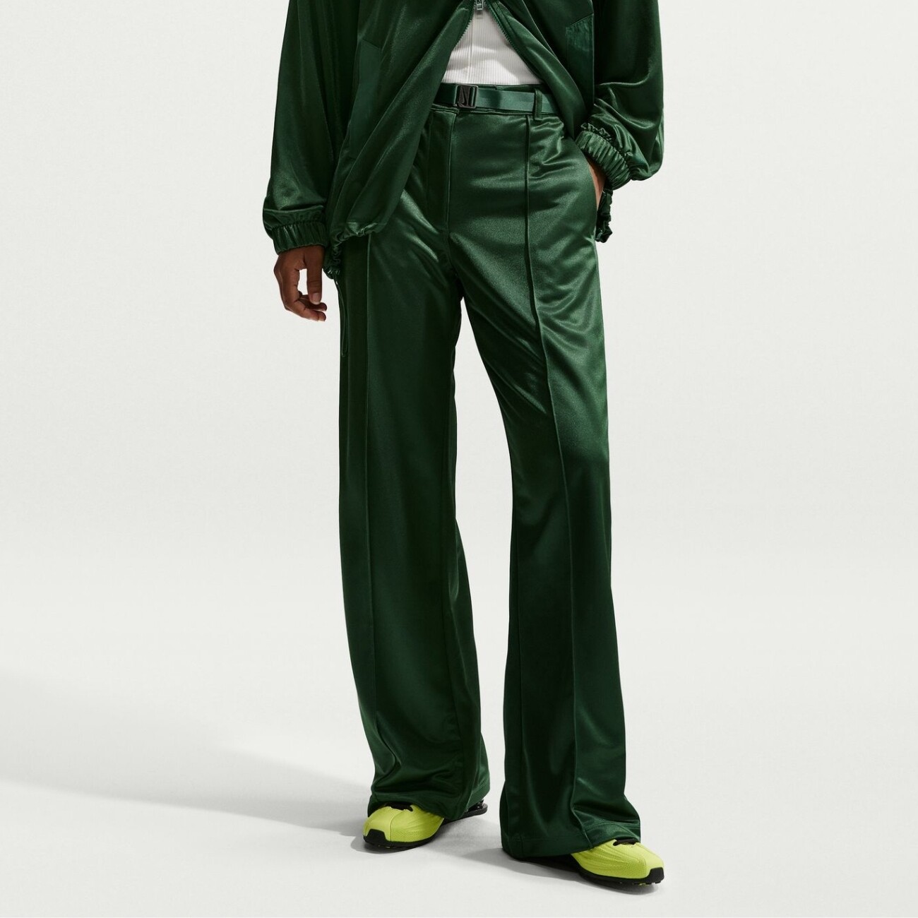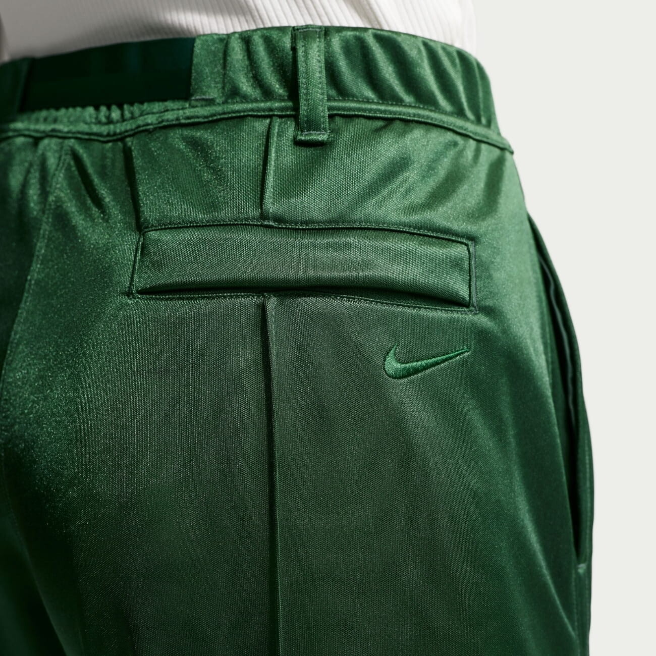 The smooth fabric with a subtle sheen gives the design a refined touch, while stitched pintucks at the front and back visually elongate the legs and add structure. The mid-rise waistband is complemented by a branded fabric belt that defines the waist and completes the look with a polished accent. A zip fly with button closure ensures a secure fit, side pockets add everyday functionality, and a snap-secure back pocket provides safe storage for small essentials. Decorative stitched creases on the front and back add neat structure to the model. An embroidered Nike logo at the back subtly reinforces the brand’s signature aesthetic and completes the design with a recognizable finish.