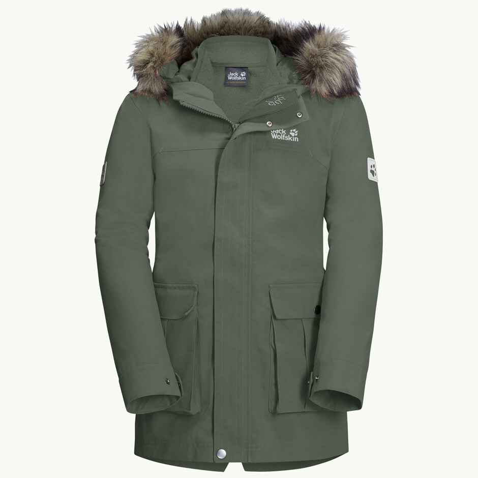 The outer parka is made of durable, soft-touch cotton-textured material that is water- and windproof. The TEXAPORE CORE membrane provides reliable weather protection while maintaining breathability to prevent overheating. An adjustable drawcord at the waist helps customize the fit, and the faux-fur-lined hood protects against wind and gives the jacket a cozy winter look.