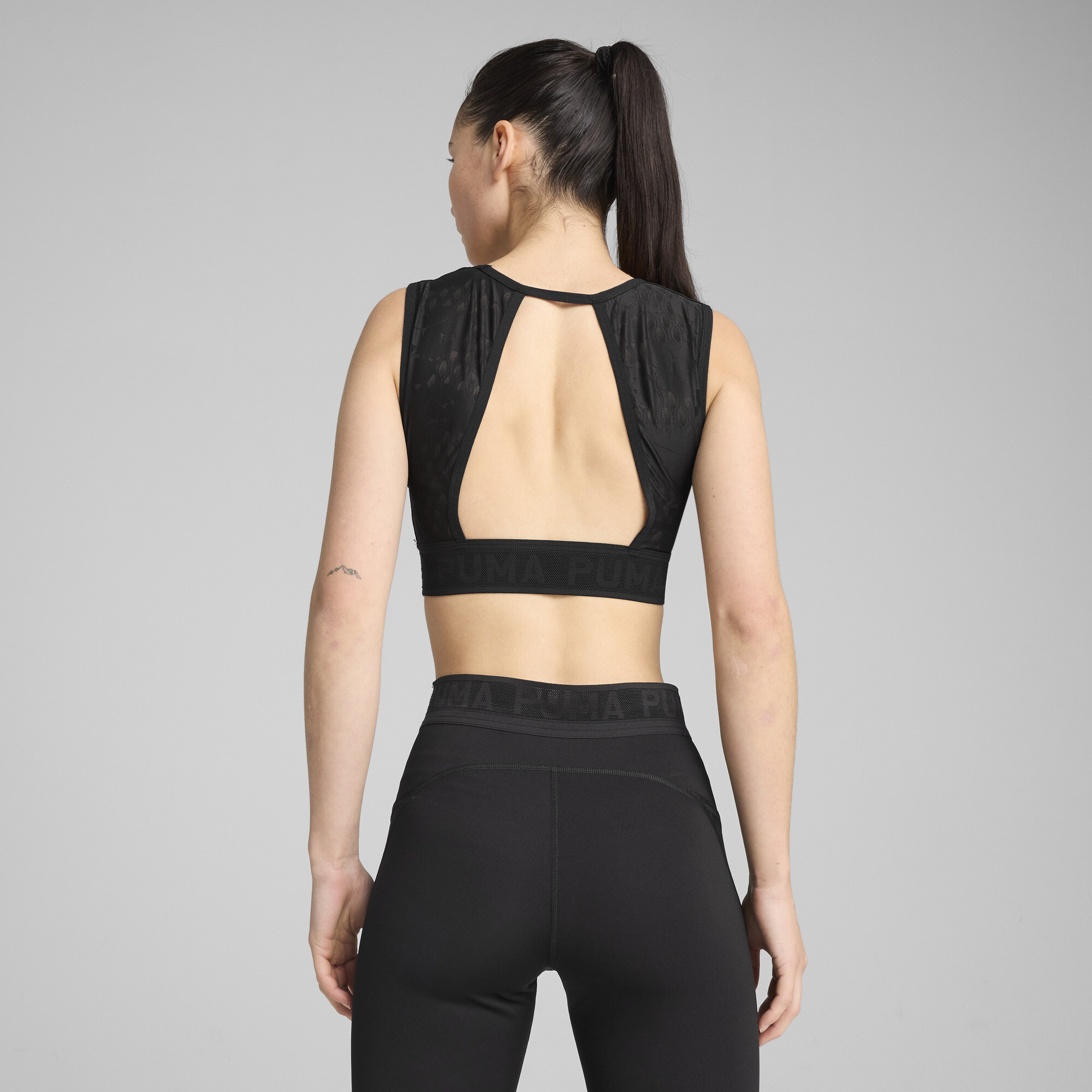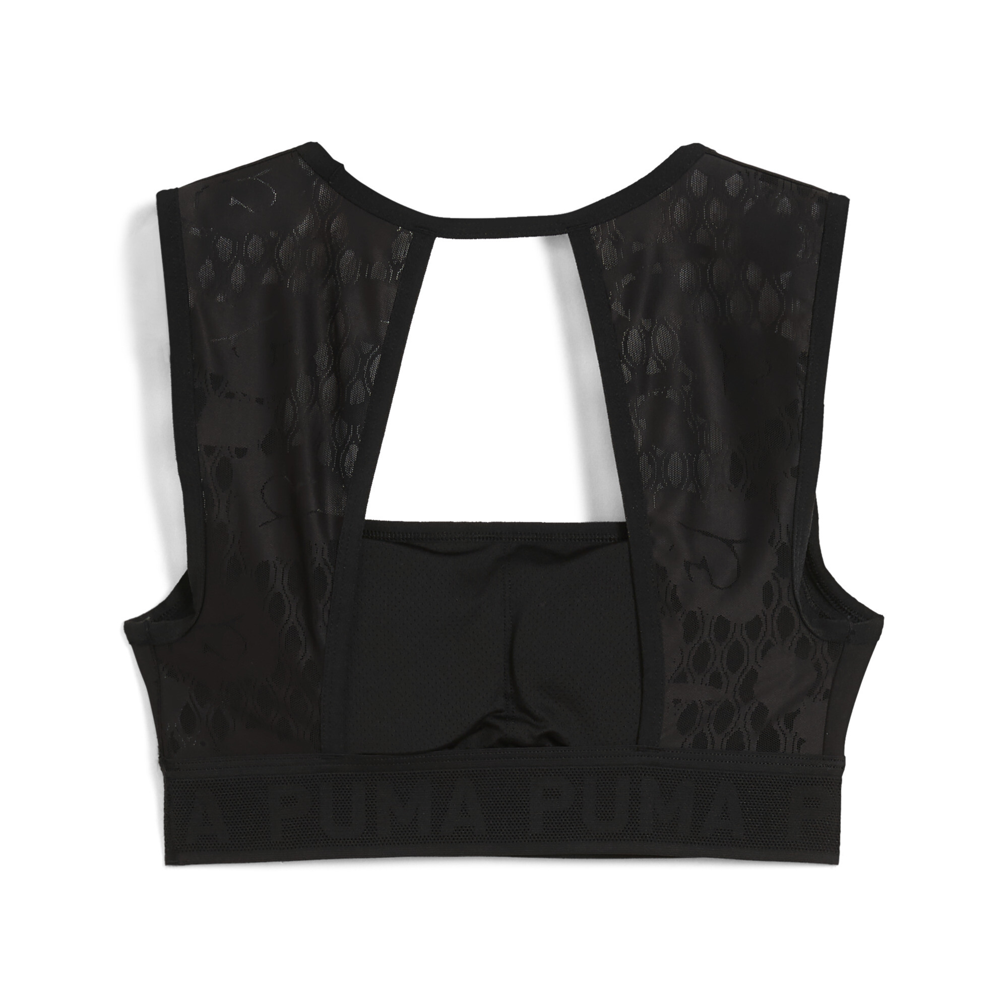 The Puma Move Lace Bra women's top is the perfect combination of functionality and stylish details, created for those who don't want to choose between comfort and fashion. dryCELL technology effectively wicks away moisture, keeping your skin dry even during the most intense moments of the day, and EVERSCULPT compression fabric provides reliable support, emphasizing the natural lines of the figure. An open back with an elegant cutout and airy lace inserts not only add sophistication, but also improve ventilation, creating a feeling of lightness with every movement. An elastic waistband with a repeating Puma logo adds a dynamic character to the image and securely fixes the top, providing maximum comfort.