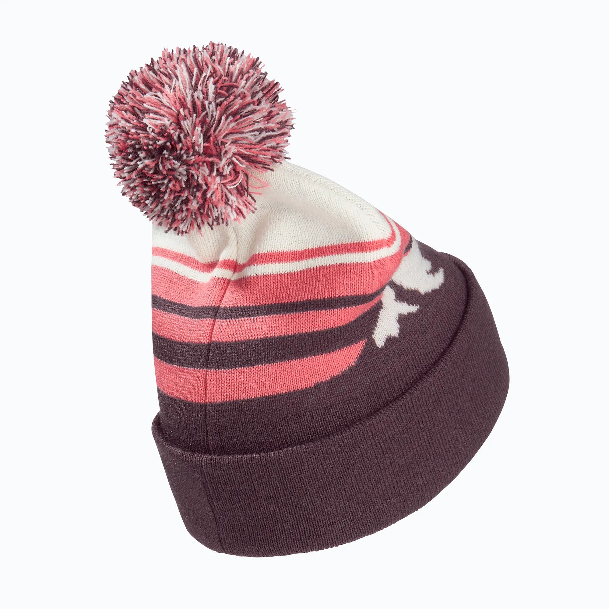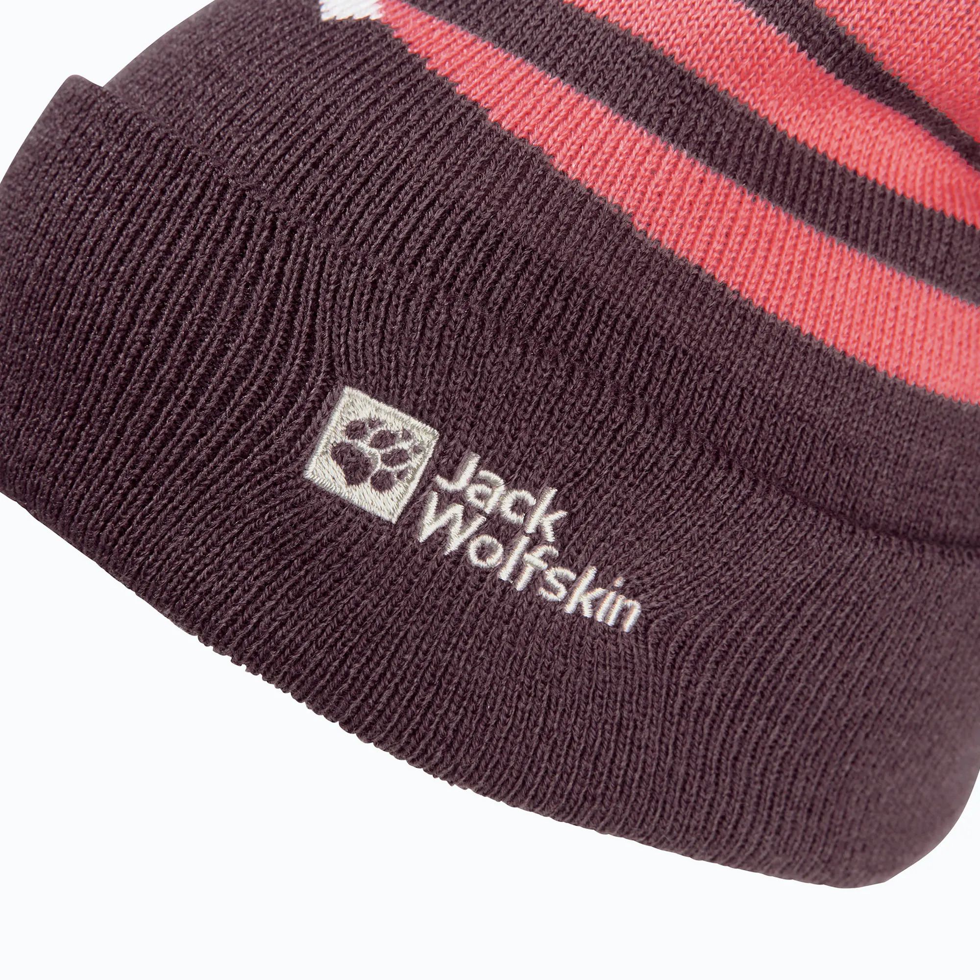 The vibrant striped design, featuring a mountain landscape, adds a truly cheerful touch, while the fluffy pompom adds a playful touch. The embroidered Jack Wolfskin logo on the front highlights the brand's signature quality and adds a stylish, recognizable touch. Its lightweight, stretchy knit ensures a comfortable fit, providing reliable protection from cold and wind.
