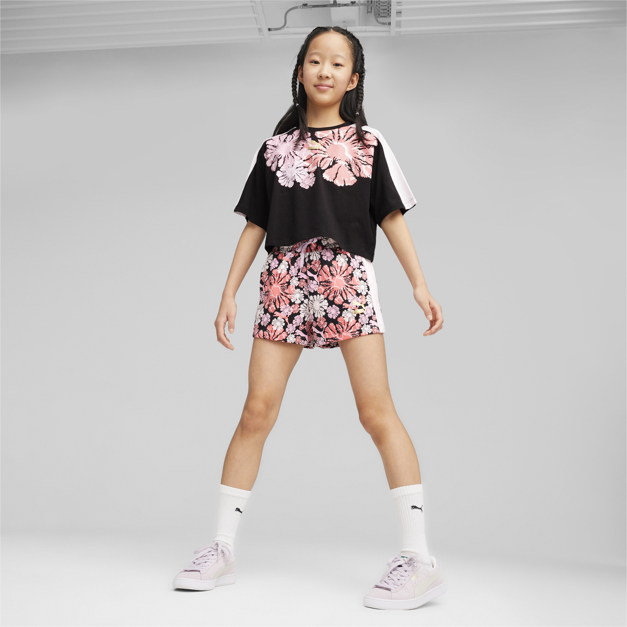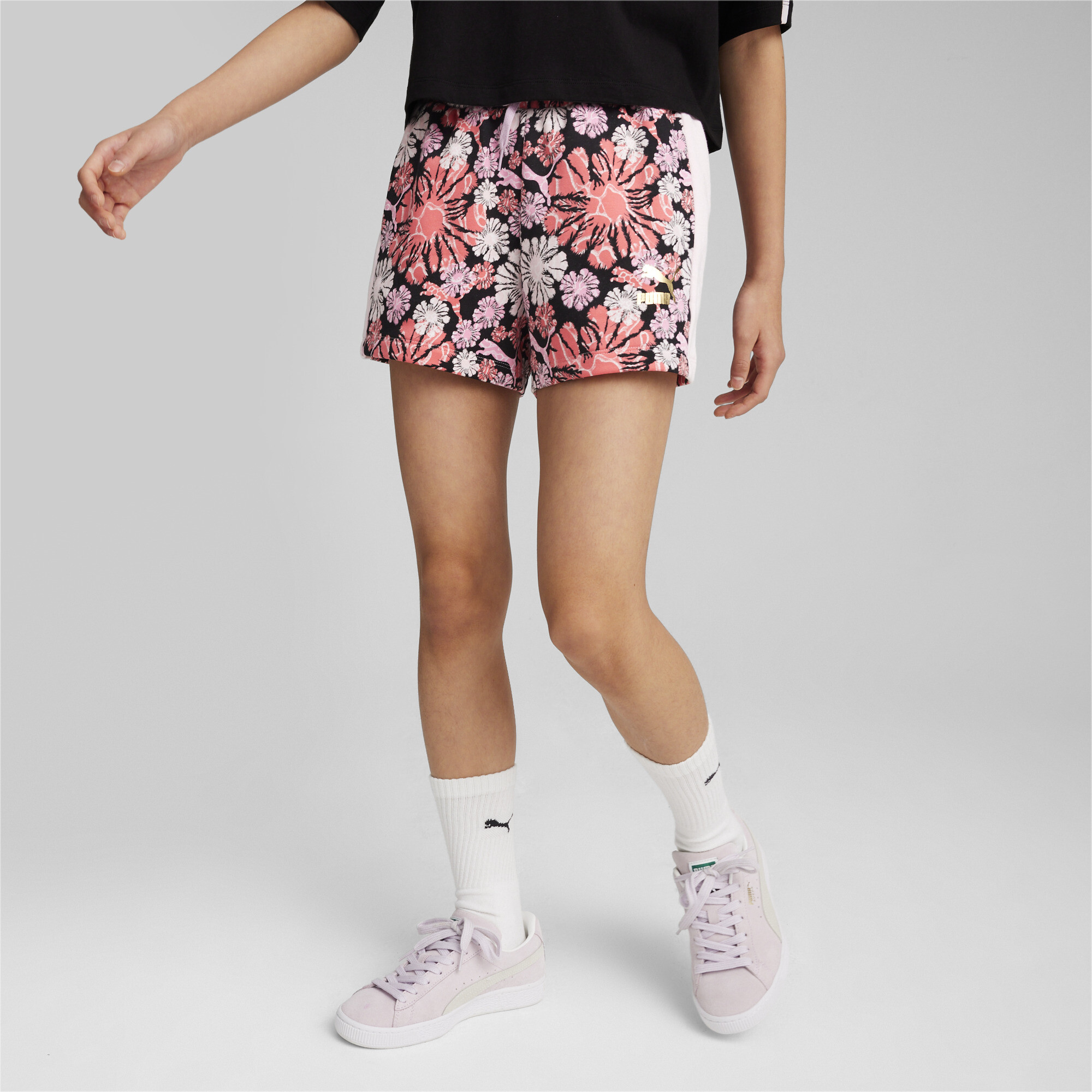 Discover the perfect shorts for girls - Puma T7 Snflr Aop Shorts G. These shorts are not only stylish but also incredibly comfortable, designed for active kids who like to stand out.