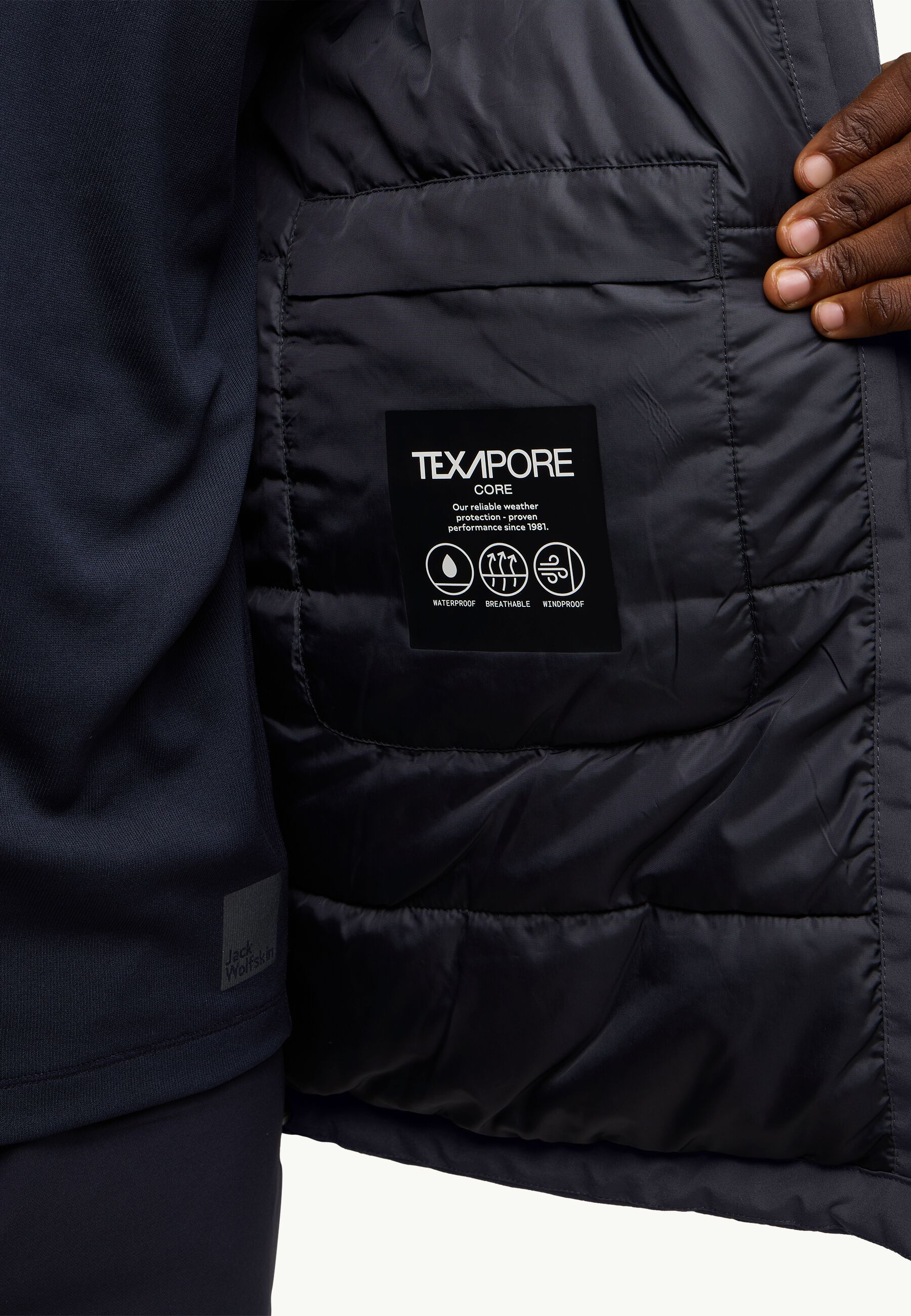 The TEXAPORE CORE face fabric is your protection from rain and wind. The waterproofness of the jacket guarantees dryness in any weather, while it remains soft and pleasant to the touch, creating a feeling of lightness, as if you are not wearing bulky outerwear at all.