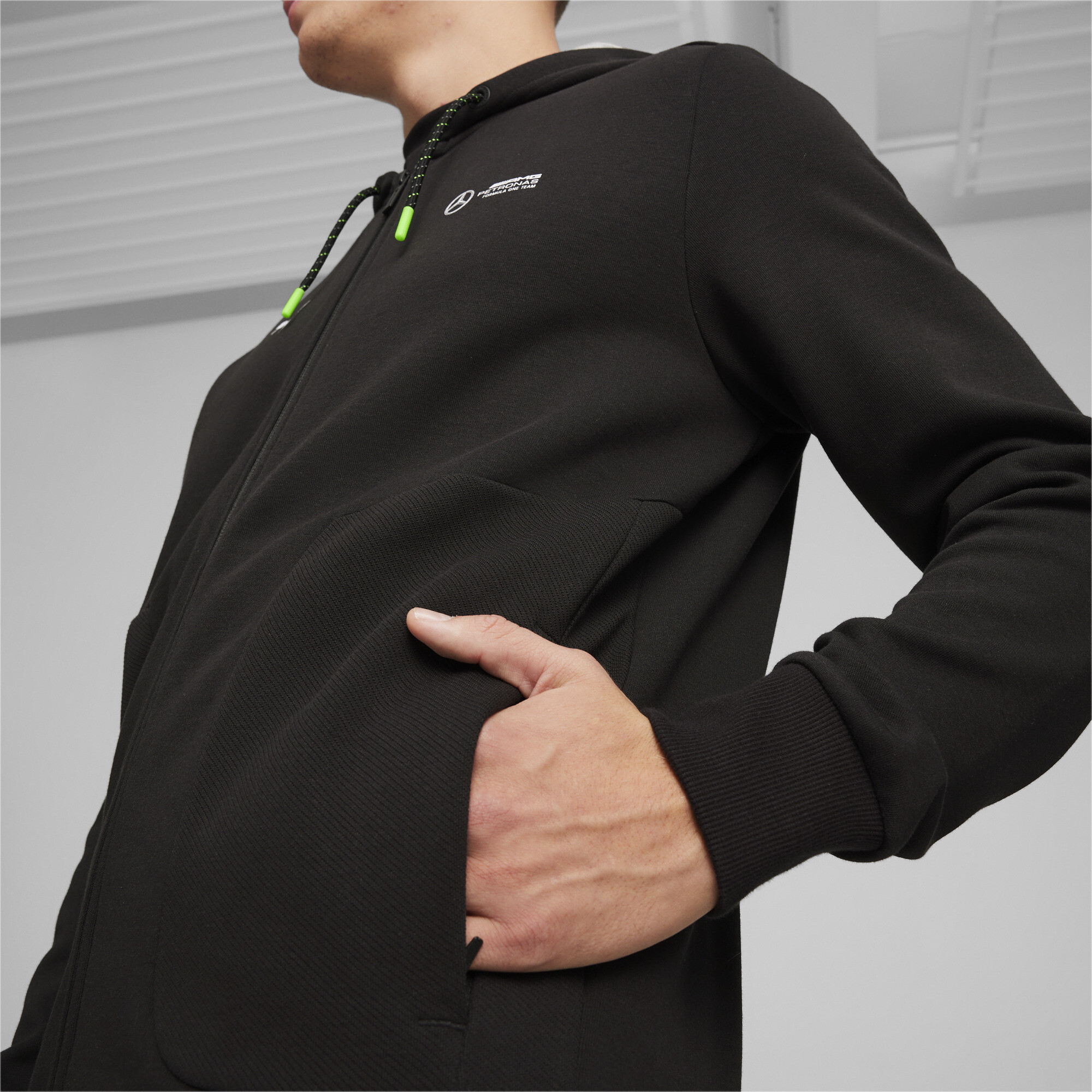 Mercedes AMG-Petronas F1® Motorsport graphics and the PUMA CAT logo highlight your commitment to your favourite team and the PUMA brand. Zipped pockets provide secure storage for your belongings during active pursuits. Ribbed hem and cuffs support the fit and keep you warm inside the hoodie. The zip makes it easy to put on and take off the hoodie.