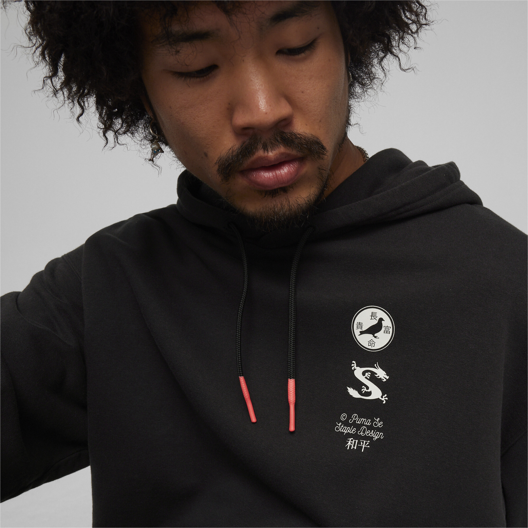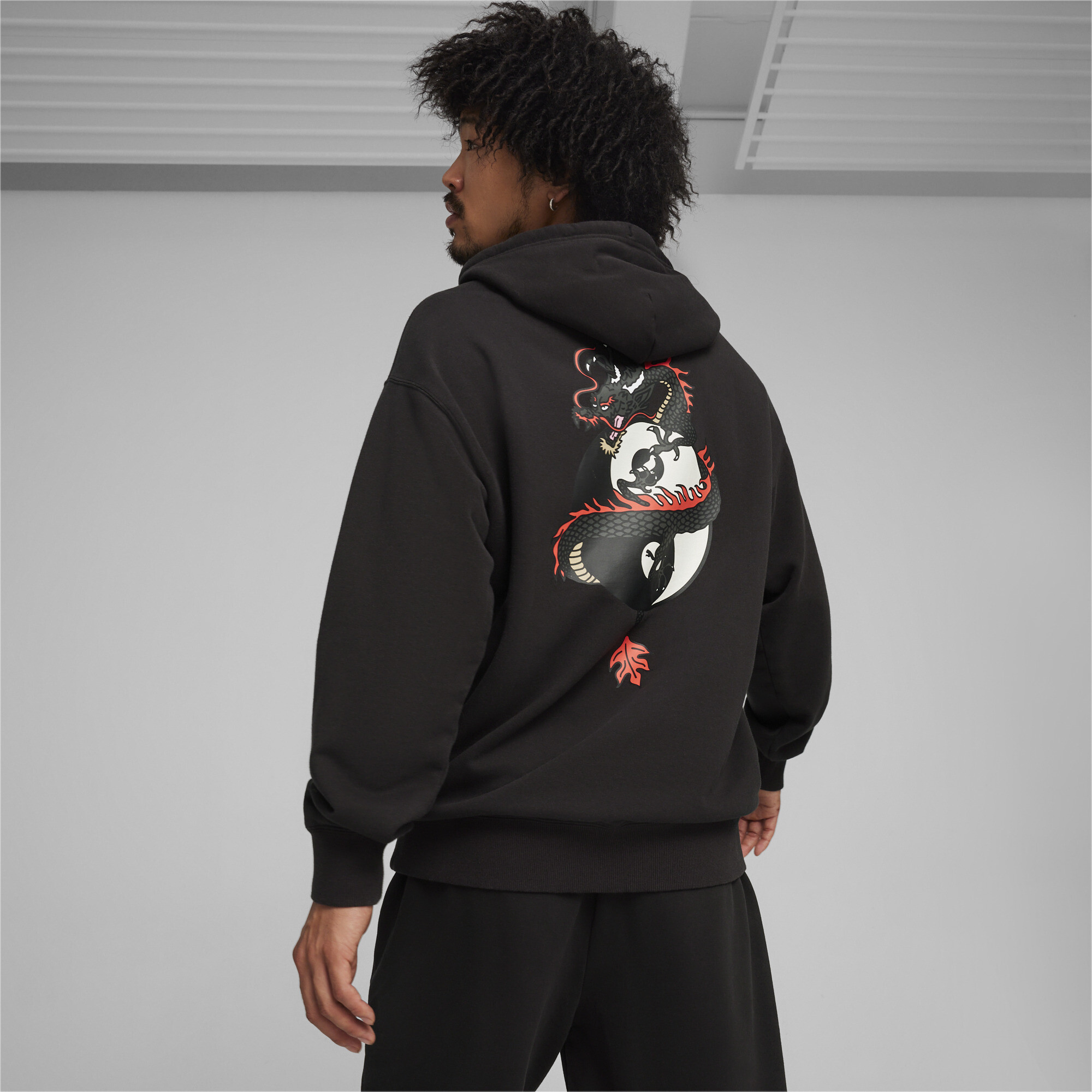 Crafted from French terry knit, it features a loose fit, ribbed cuffs and hem, a hood with metal-tipped drawstrings and a PUMA logo to the left chest. It also features an iconic rubberised print with a dragon and the ancient Chinese Yin-Yang symbol on the back.