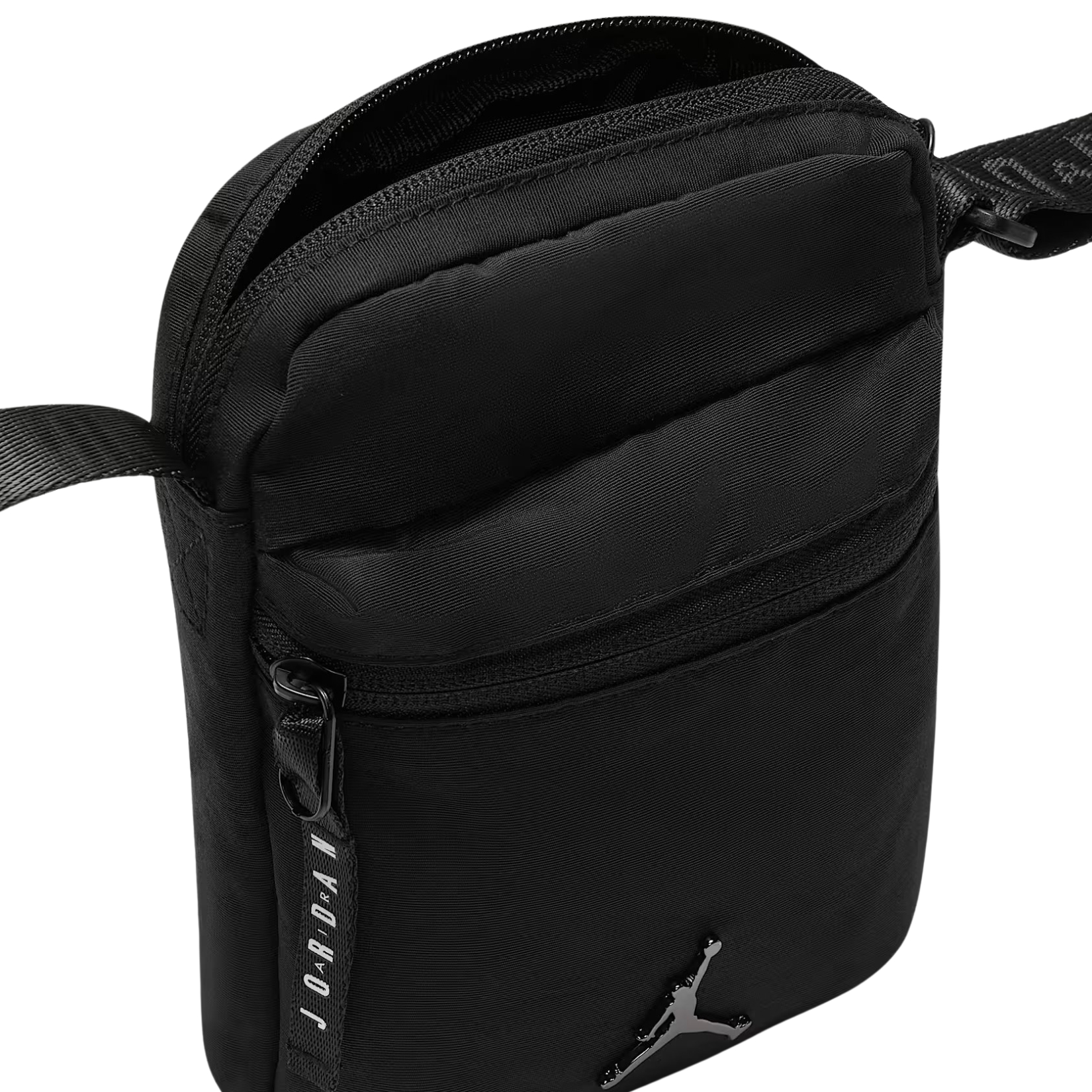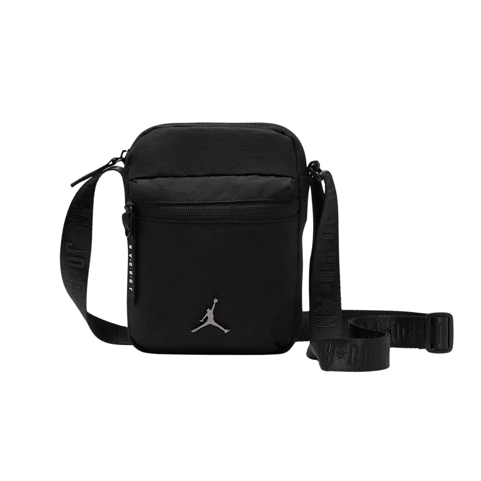 The main zippered compartment holds your phone, keys, and other essentials. An additional zippered pocket on the front offers quick access—storing your travel pass or headphones is a breeze. An adjustable strap with signature Jordan branding and a logo-embossed zipper pull add a stylish touch, while a metal Jumpman logo on the front completes the design, underscoring your connection to the iconic brand.