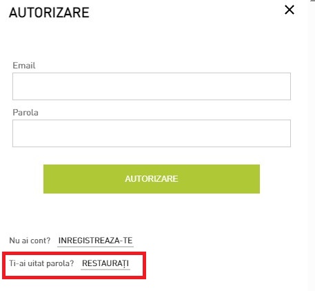 În cazul în care v-ați uitat parola, utilizați sistemul de recuperare din fereastra "AUTORIZARE", făcând clic pe link-ul "RESTAURAȚI".