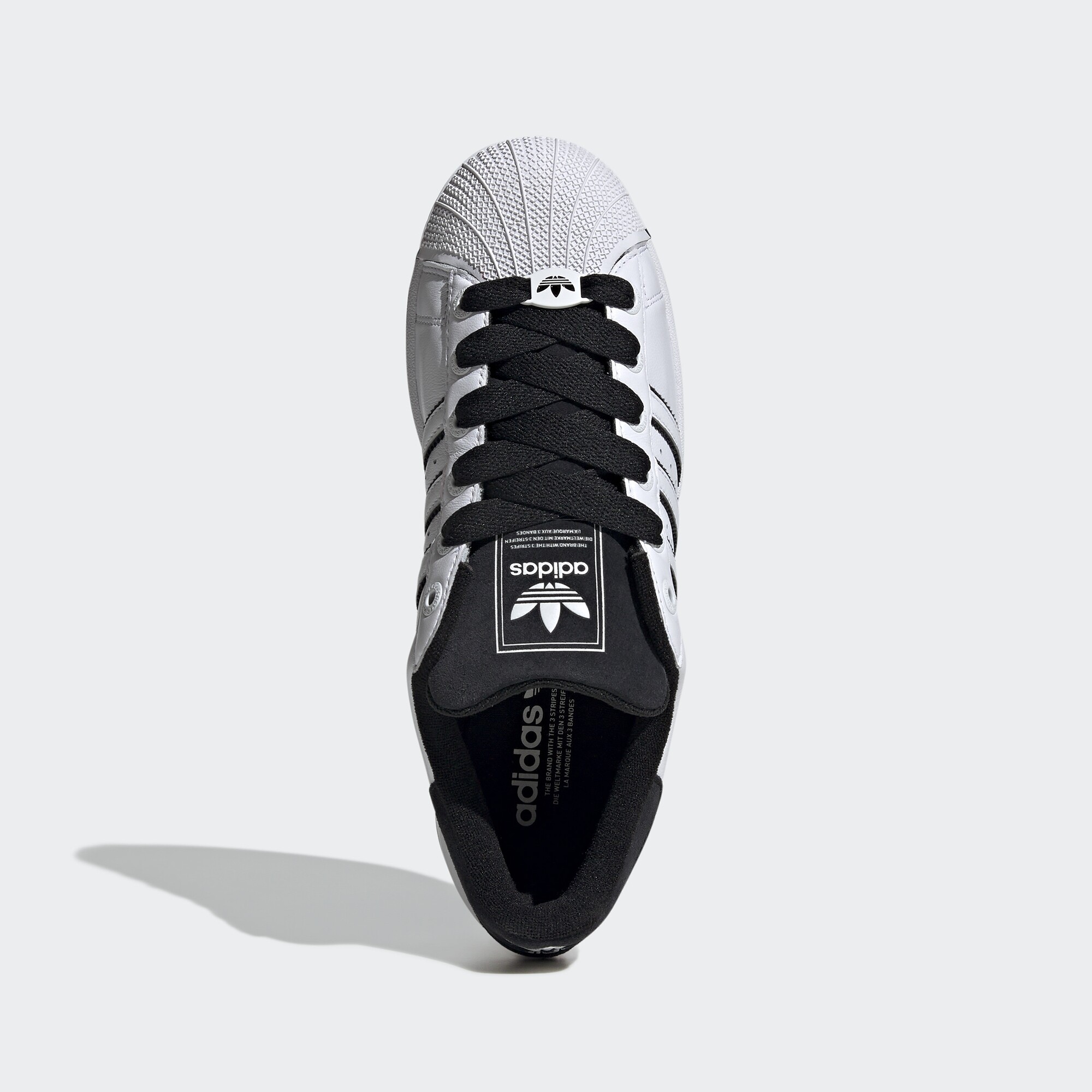 Cele trei dungi zimțate caracteristice adidas pe laterale, inscripția Superstar și logo-urile de pe limbă și călcâi sunt detaliile care fac acest model iconic și ușor de recunoscut. Este o încălțăminte în care stilul clasic nu își pierde niciodată actualitatea, iar stilul merge mână în mână cu confortul.