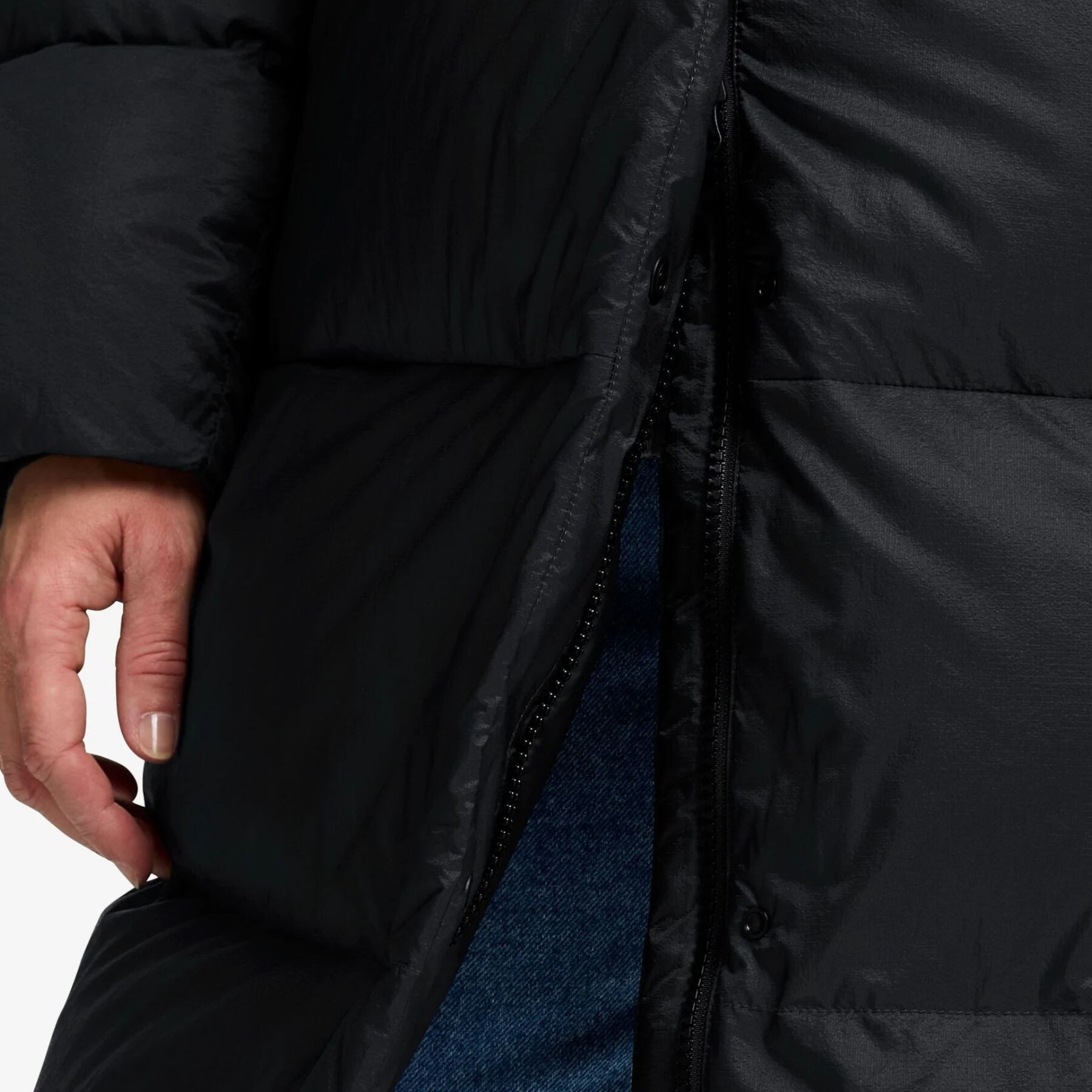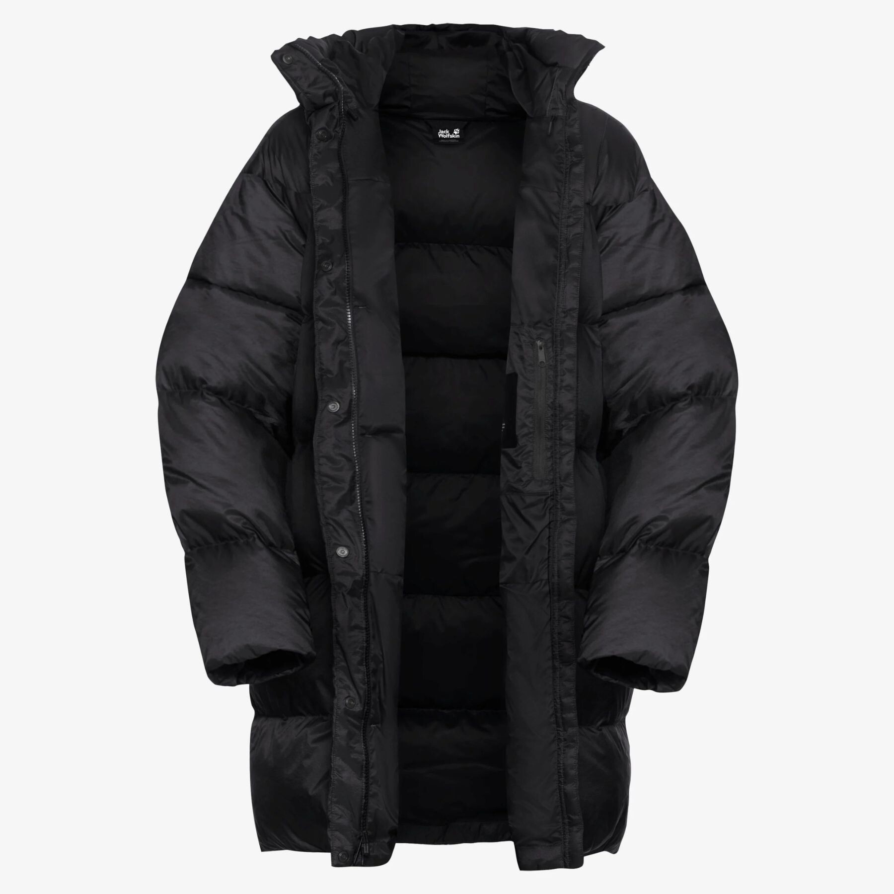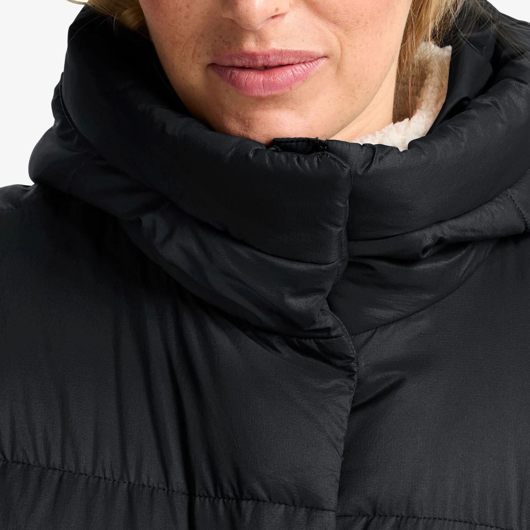 Gluga fixă, cu regularea câmpului vizual, se potrivește confortabil și protejează de vânt și ninsoare, iar manșetele elastice interioare împiedică pătrunderea frigului. Fermoarul bidirecțional, completat de o clapă cu capse, oferă protecție suplimentară împotriva vântului și libertate de mișcare. Buzunarele laterale și cel interior asigură spațiu sigur pentru obiectele esențiale.