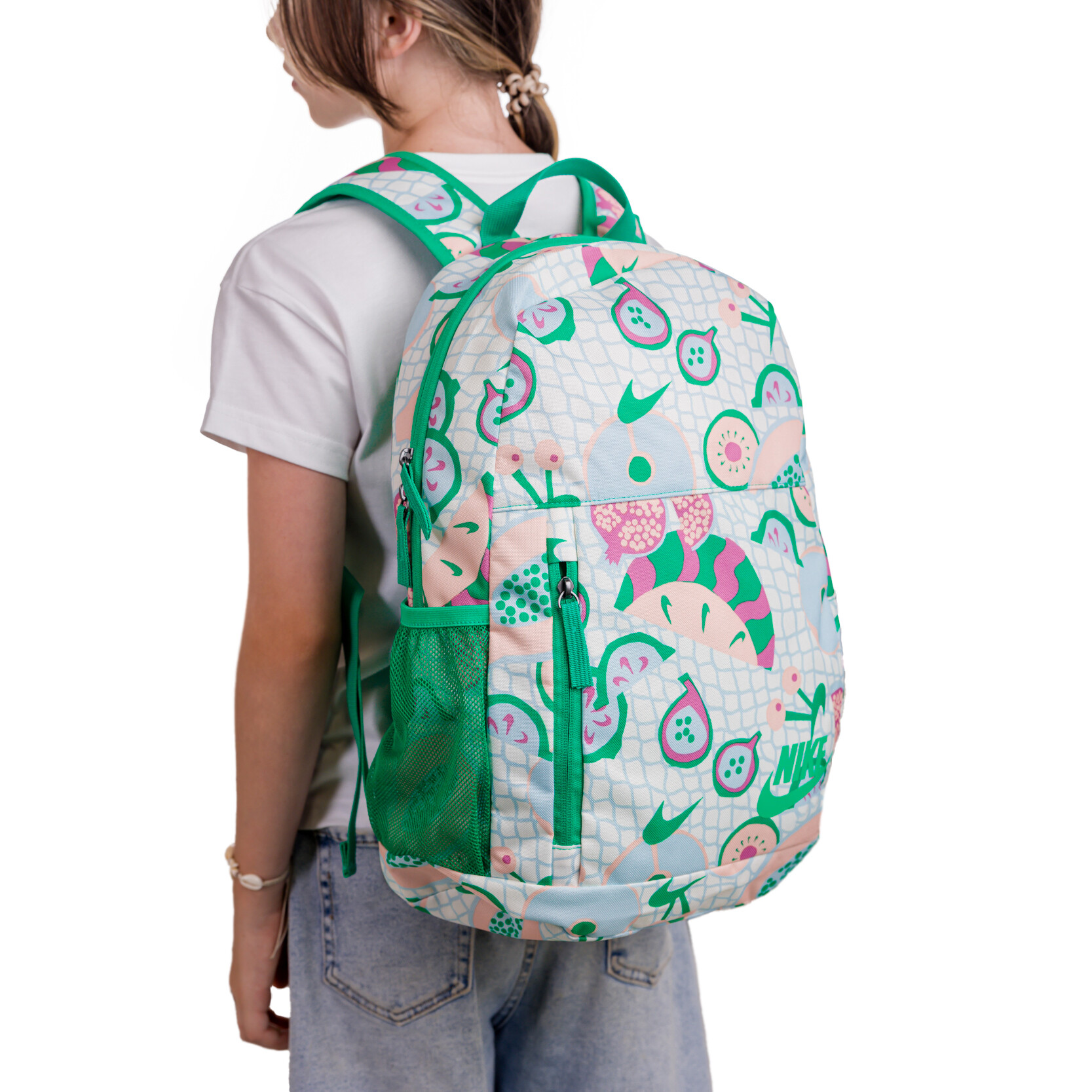 Его большое основное отделение с двусторонней молнией позволяет легко поместить книги, ноутбук и другие важные вещи, сохраняя порядок и быстрый доступ. Дополнительные передний и боковые карманы прекрасно подходят для мелких предметов — будь то ключи, зарядное устройство или бутылка с водой, — что делает рюкзак по-настоящему функциональным и продуманным до мелочей. Особое внимание заслуживает съемный пенал, который крепится снаружи, позволяя удобно хранить мелкие вещи отдельно от остальных вещей. Мягкие регулируемые ремни обеспечивают комфорт при носке, а сетчатая задняя панель поддерживает вентиляцию, не давая спине перегреваться. Стильный графический принт и аккуратно напечатанный логотип Nike придают рюкзаку современный и выразительный вид, который дополнит любой образ.