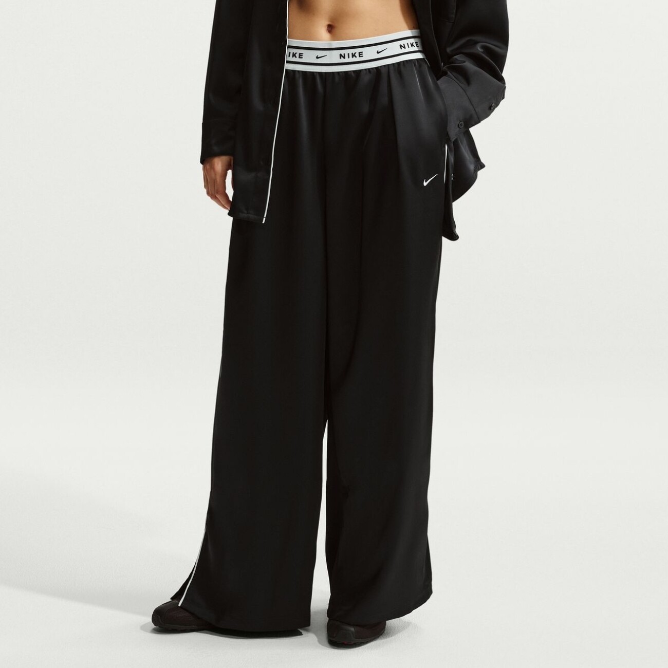 Женские штаны Nike Sportswear Loose Mid-Rise Satin сочетают элегантный внешний вид и спортивную эстетику, создавая выразительный элемент повседневного гардероба. Свободный крой с широкой формой штанин и средней посадкой обеспечивает комфорт и формирует современный расслабленный силуэт, который легко вписывается как в спортивные, так и в более утончённые образы.