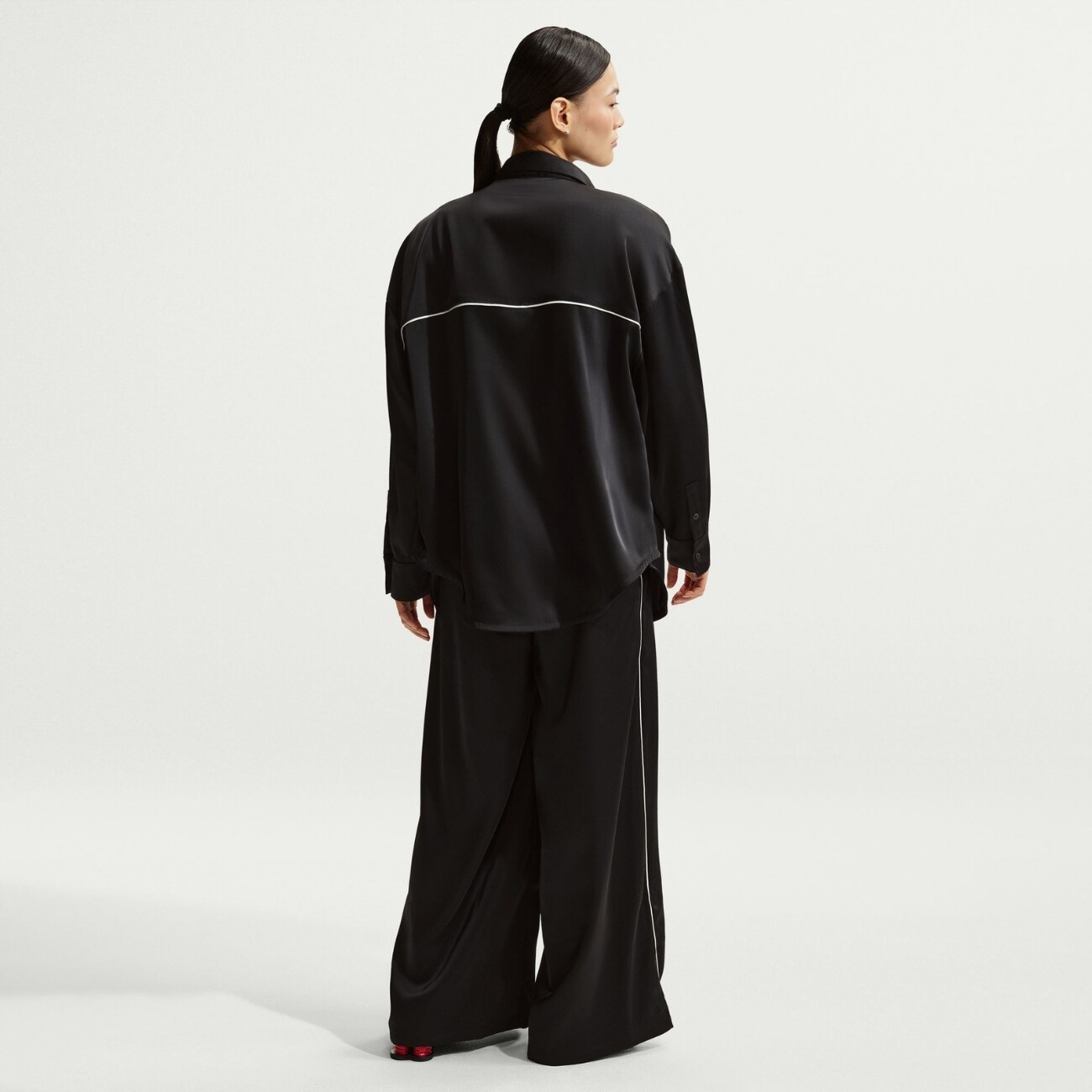 Гладкая сатиновая ткань придаёт модели мягкий блеск и ощущение лёгкости, создавая ощущение комфорта в течение всего дня. Лёгкий материал приятно прилегает к телу и делает штаны удобными для повседневного ношения, сохраняя аккуратный и стильный внешний вид.