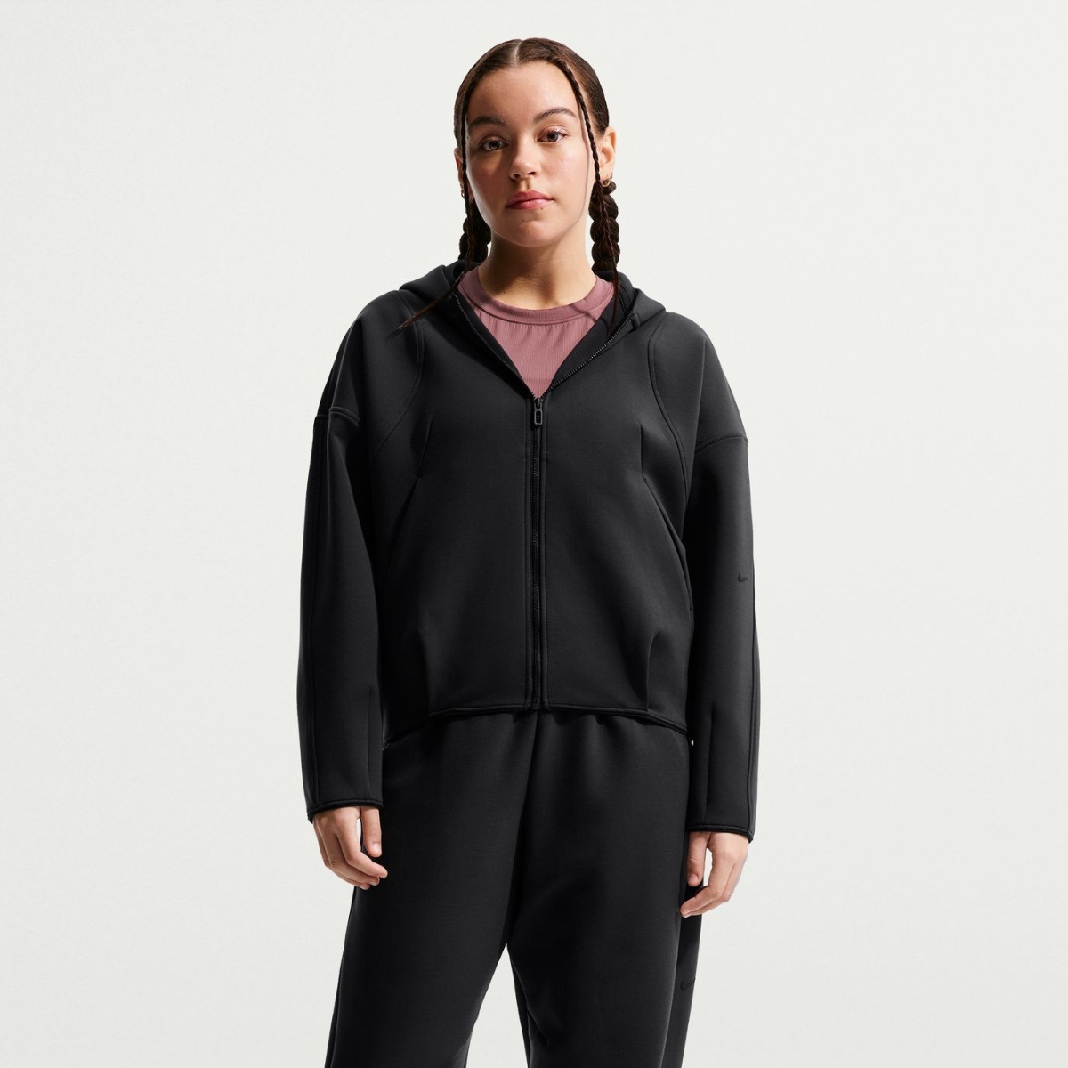 Свободный крой дополнен внутренним эластичным поясом и вытачками, которые формируют объёмный силуэт с мягкими складками и улучшают посадку. Молния с мягким пуллером обеспечивает удобство в использовании, а глубокий капюшон добавляет дополнительную защиту от холода. Логотип Nike Swoosh на рукаве подчёркивает фирменный стиль и завершает образ аккуратным спортивным акцентом.