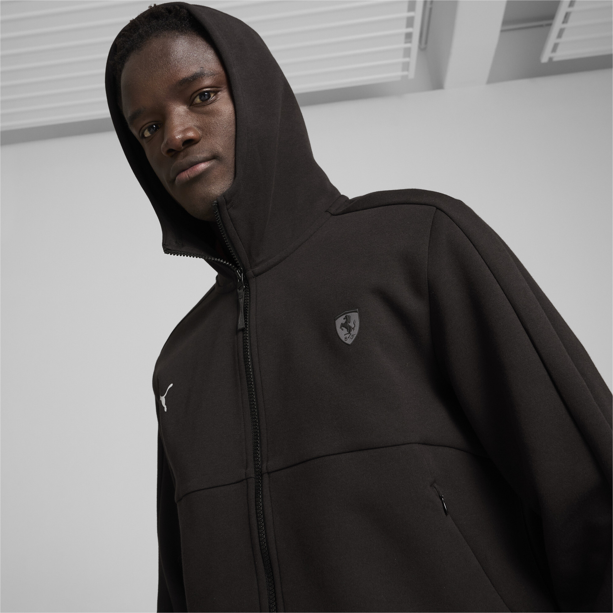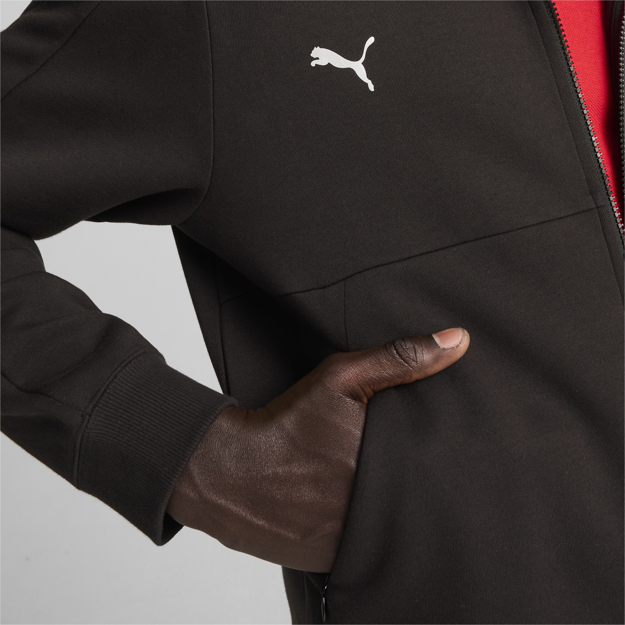 Боковые карманы на молнии — не только стильный элемент, но и практичное решение для хранения мелочей. Визуальной изюминкой толстовки является яркий прорезиненный щит Scuderia Ferrari на груди, который дополняется изящным логотипом PUMA Cat. Эти детали делают модель настоящим заявлением о Вашей любви к скорости, роскоши и совершенству.