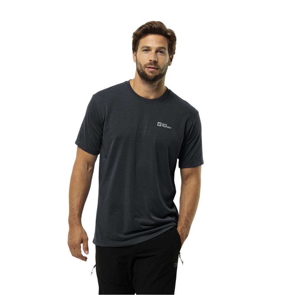 Эта футболка сочетает в себе не только функциональность, но и стиль, предоставляя вам возможность чувствовать себя комфортно и выглядеть стильно в любой ситуации. Ее дышащая ткань TEXADRI из однослойного трикотажа не только впитывает влагу, но и предотвращает появление неприятных запахов, позволяя вам чувствовать себя свежим весь день. Напечатанный логотип Jack Wolfskin придает этой футболке неповторимый стиль.